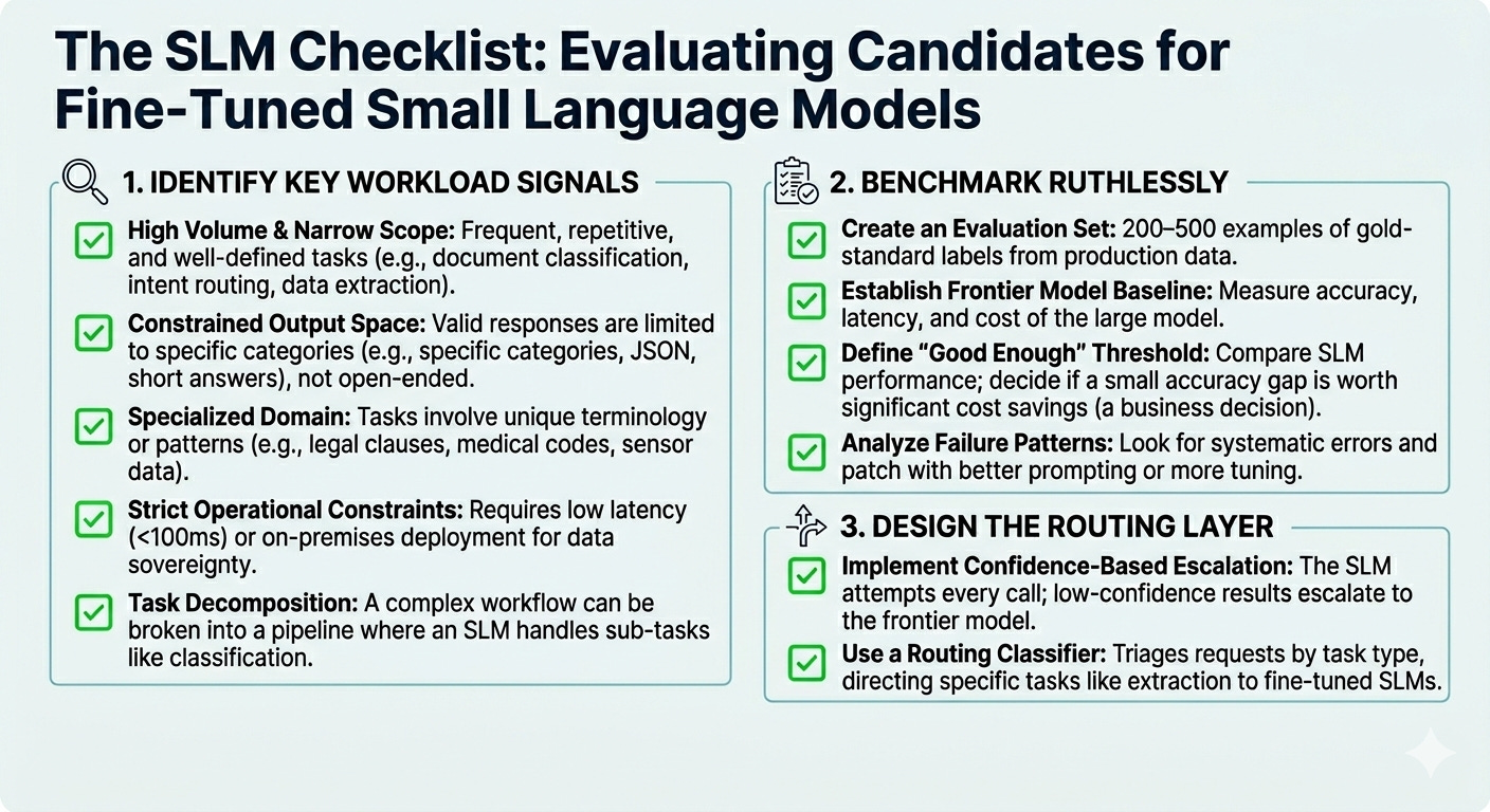 For each candidate workload, build a task-specific evaluation set of 200 to 500 examples with gold-standard labels, drawn from production data. Establish the frontier model baseline — accuracy, latency, and cost per call. Then test two or three SLM candidates both zero-shot and fine-tuned.