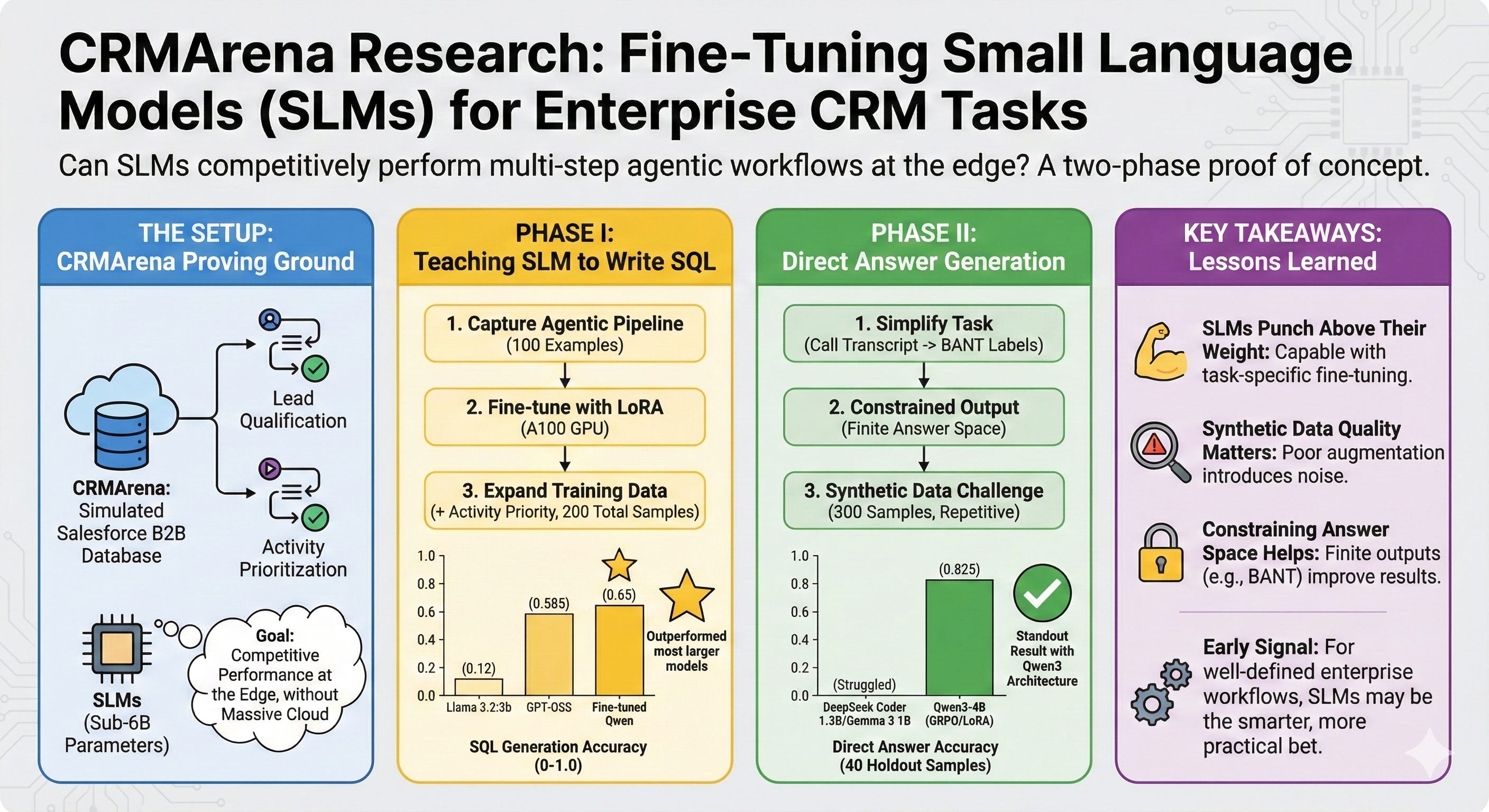 Our first attempt focused on one specific piece of the puzzle — generating the SQL queries that pull the right data from Salesforce. We simulated the full agentic pipeline across all 100 examples in the CRMArena database, capturing the conversation flows that lead to valid SQL output. Then we used that data to fine-tune several sub-6B parameter models using LoRA adapters on an A100 GPU.
